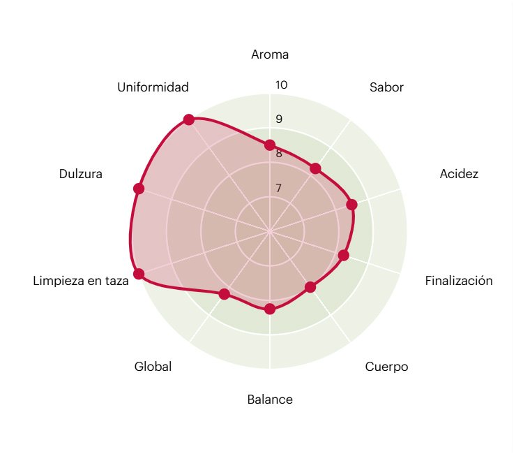 Destaca su acidez cítrica brillante y compleja, equilibrada por un cuerpo sedoso y un dulzor que recuerda a la miel y el chocolate negro.